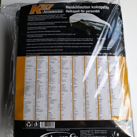 Materiaali silikonikäsiteltyä polyesterikangasta. Pakkasenkestävä ja 100% vettähylkivä. Suojaa pölyltä, sateelta, lumelta, jäältä ja auringolta. Hengittävä materiaali minimoi kondensioveden muodostumisen auton pinnan ja peitteen väliin. Peitteen etu- ja takaosassa on joustoresori ja keskellä kiinnityshihna.
