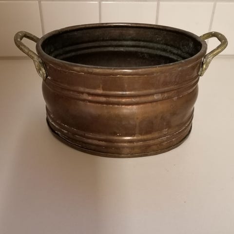 Vanha kuparinen seinäänkiinnitettävä ruukku, korkeus 14,5 cm, leveys 13 cm.