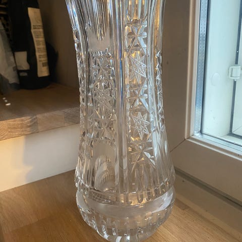 Kaunis, kukkakuvioinen kristallimaljakko. Korkeus n.20cm, halkaisija ylhäältä n. 7cm, kapenee alaspäin.