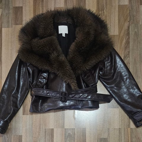 Uudenveroinen tekonahkainen Biker-talvitakki, jossa irrotettava ihanan sininen karvakaulus.