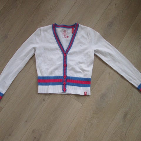 Esprit-merkkinen neuletakki, tyyliltään muistuttaa baseball-takkia. Kokomerkintä 128/134 cm. Laput irrotettu mutta käyttämättä jäänyt.