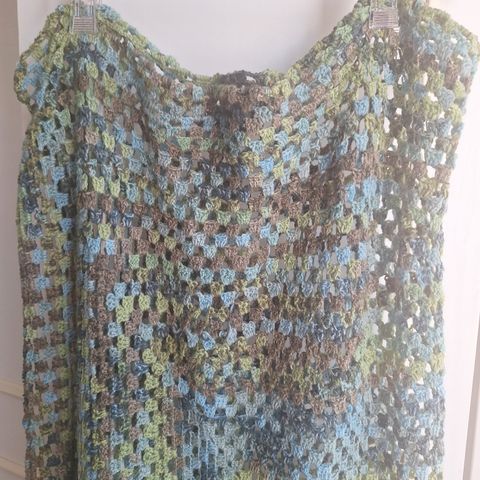 Käsityönä kalastajalangasta tehty virkattu peitto