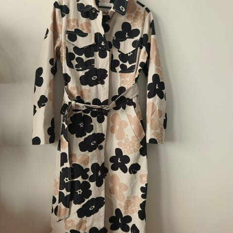 Marimekon tummansininen vuoreton takki. Takissa on napinlävet, mutta nappeja ei. Solmitaan vyöllä. Toisessa hihassa pieni jälki. Muuten kunto oikein hyvä! Koko S.