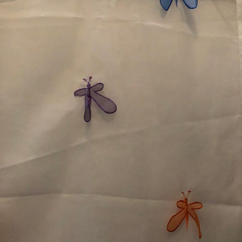 Jouverhot, punaiset harsomaista läpikuultavaa kangasta, jossa enkelihahmoja.