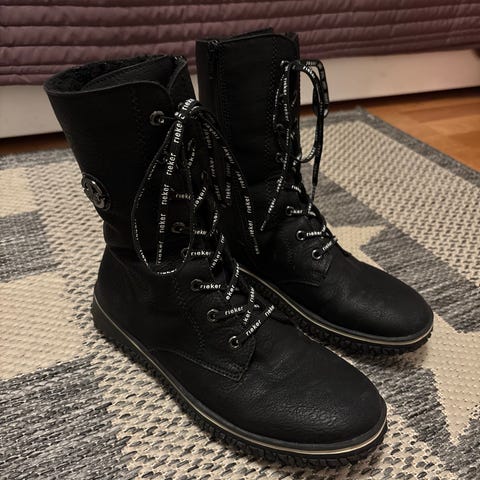Rieker talvikengät koko 39, vihreä väri, valmistettu nahasta. Kengät soveltuvat talvikäyttöön ja tarjoavat suojaa kylmiltä ja kosteilta olosuhteilta. Mallissa on nyöritys ja vetoketju sivussa helpottamassa pukemista.Koko vastaa paremmin 38 kapea malli