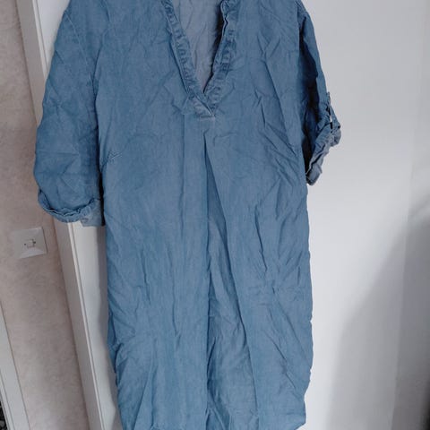 Farkkupaita divided by H&M. 99 % puuvillaa, 1 % elastaania. Olka-helma pituus n. 60 cm, kainalo-kainalo n. 43 cm. Nepparit/painonapit. Vähän joustava kangas.