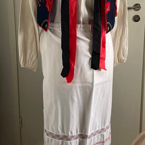 Koko 34, helma 76,5cm + vara 7cm. Liivin kork. 40cm, vyötärö 72cm, rinnanymp. 85cm, essun pituus 64cm. Paidan hihan pituus 54cm.
