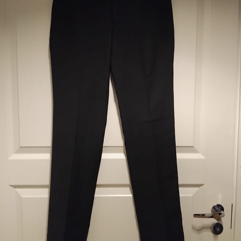 Selected hommen mustat, uudenveroiset housut syksyn ja talven juhliin. Koko 44. Sopii hyvin 165-170 cm kokoiselle. Mittoja: haara-lahje 80,5cm ja vyötärö-lahje 104 cm. Kaksi sivutaskua ja takana kaksi napillista taskua.