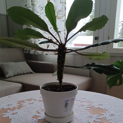 Kuvan nukkatyräkki on noin 10cm korkea, siis vielä taimi, mikä kasvaa reilun metrin mittaiseksi oikeissa olosuhteissa. Hyvä sisustuskasvi.