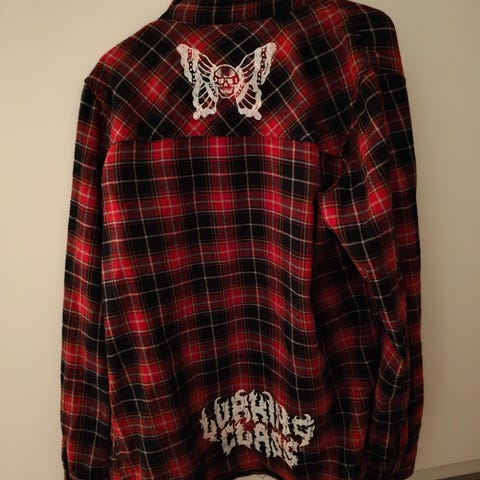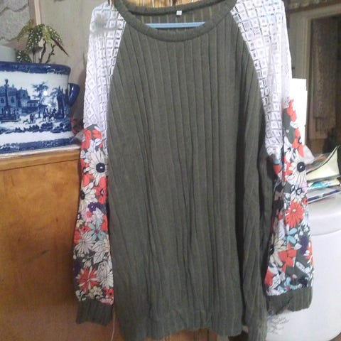 Tukeva, vuorillinen röyhelöpusero, edessä kirjailua, t.sininen. Takana vetoketju. Helmassa neljä viiden sentin halkiota. Vyötärön ympärysmitta 94-95 cm. Pari kertaa käytetty. Pieni tahra edessä, näkyy kuvassa, peittyy nauhoilla.