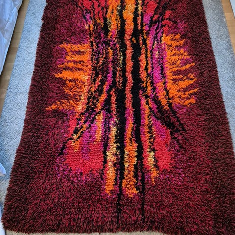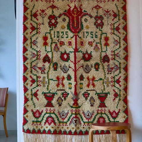 Hyväkuntoinen, ehjä ja puhdas ryijy. Korkeus 170 cm (150 cm + hapsut 20 cm), leveys 110 cm.