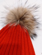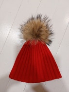 Punainen pipo jossa ylellistä 50% cashmere/angora villaa, turkistupsu.