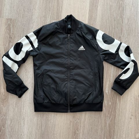 Kiiltäväpintainen adidas tuulitakki trikoovuorella. Hupun saa kauluksen sisään. Pääosin musta, olkapäiltä kellertävän vihreä. Kokolapussa 34-36, lähinnä vastaa kuitenkin XS kokoa ja siksi jäänyt vähälle käytölle.