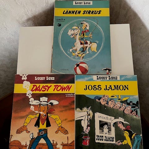 Myydään Lucky Luken sarjakuvakirjat Valkoinen ratsastaja ja Laulava lanka. Kumpikin 1. painoksia vuosilta 1976 (Valkoinen ratsastaja) ja 1979 (Laulava lanka). Kummassakin piirrokset Morris ja tekstit Goscinny.