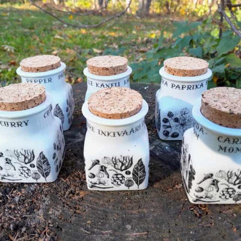 Kuusi Arabian vanhaa maustepurkkia korkkikannella. Kaksi purkkia 30 e. Kaikki purkit erittäin hyvässä kunnossa, ei säröjä, eikä halkeamia. Purkkien korkeus 9 cm.