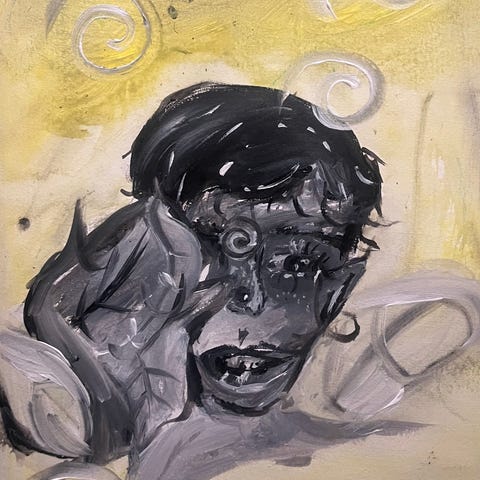 40x50 cm. Akryylimaalaus, jossa on kuvattuna vaaleahiuksinen kasvokuva. Maalaus on tehty kankaalle ja siinä on tumma tausta sekä vaaleat kukkakoristeet. Teos on käsin maalattu