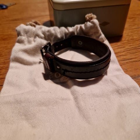 Miesten käytetty Fossil rannekoru. Yksi Fossil-tekstilaatta pudonnut ja pientä naarmua pinnassa, kuitenkin yhä käyttökelpoinen.