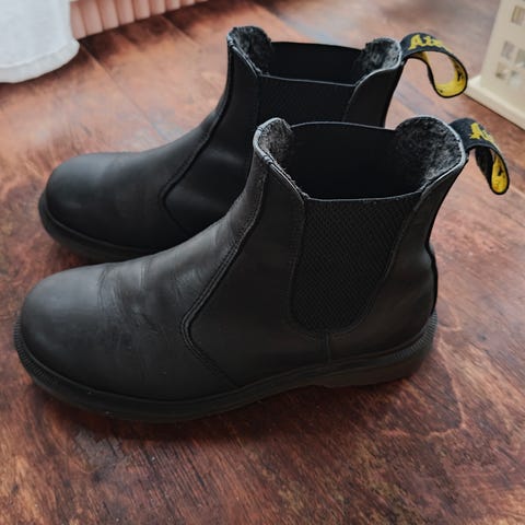 Dr. Martens beige nahkaiset saappaat, koko 39. Saappaissa on mustat joustavat sivupaneelit ja paksu musta kumipohja, joka tarjoaa hyvän pidon. Malli on nilkkapituiset Chelsea-tyyliset saappaat, jotka sopivat monipuoliseen käyttöön.