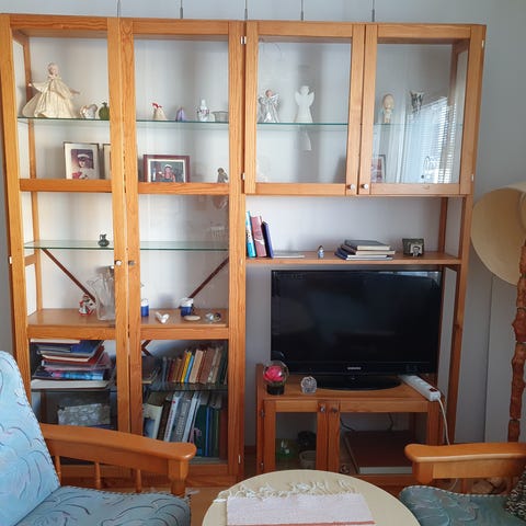Myydään Lundian männystä tehty kokopuinen, tukeva avohyllykkö, jossa on 7 siirrettävää hyllytasoa.
