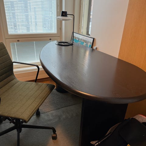 Hienoa korkeussäädettävä design työpöytä myytävänä. 1,2 cm paksu laskikansi sekä pukkijalat. Lasin kulmassa pieni kolhu, lasista ei puutu palaa. Jalat erinomaisessa kunnossa ja kaikki toimii.