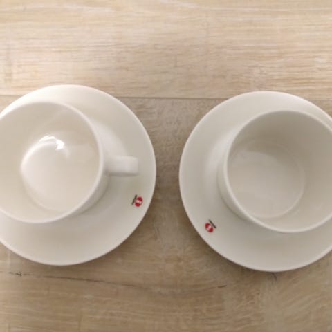 3 murokulhoa, 4 mukia, 4 kahvikuppia aluslautasineen sekä kermakko ja sokerikko. 30€