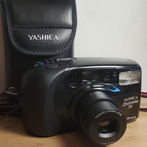 Yashica Zoomate 8mm elokuvakamera mustalla rungolla ja objektiivilla. Mukana musta nahkainen kantolaukku, jossa olkahihna. Kamera soveltuu 8mm elokuvien kuvaamiseen. Kantolaukussa on lukitus ja se on suunniteltu kameran suojaamiseen ja kuljettamiseen.