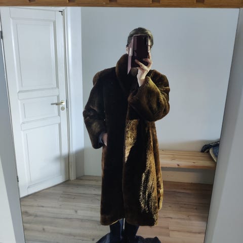 Hihojen alapinnalta turkis kulunut ja ohentunut, mutta nahka ehjä. Vuori irti ja repeytynyt kainaloista. Toisessa hihansuussa vuorikangas kulunut ja toisessa hieman repeytynyt irti. Helman yhdellä sivulla turkis myös kulunut, samoin vasemmalla puolella olkapäällä. Etuliepeiden reunat kuluneet. Takki tulee taloudesta jossa tupakoitiin sisätiloissa: se on ollut tupakoimattomassa tilassa kesäkuusta 2025, mutta turkista EI ole pesty tai puhdistettu, joten herkkänenäisimmät haistanevat tupakanhajun varmasti. Paria nappia on siirretty hiukan. Kaiken kaikkiaan kulunut ja käytetty takki, joka toiminee jollekulle joka haluaa tehdä jotain nahkasta ja turkiksesta.