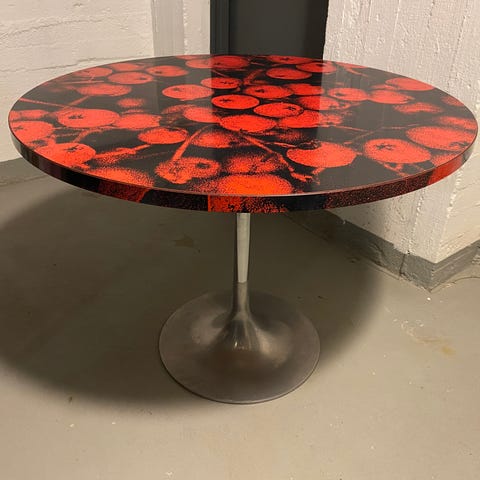 Marimekko Unikko pöytä 1970-luvulta halkaisija 120 cm. Pöydän kansi on koristeltu punaisilla ja vaaleanpunaisilla kukkakuoseilla. Pöydän jalat ovat valkoiset. Iän mukaista kulumaa.
