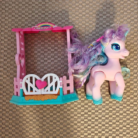 Myydään söpö heppa, talli ja harja pikku leikkijälle. Jäänyt vähälle käytölle. Kivat äänet ja musiikki kuuluu tallista kun painaa napista.