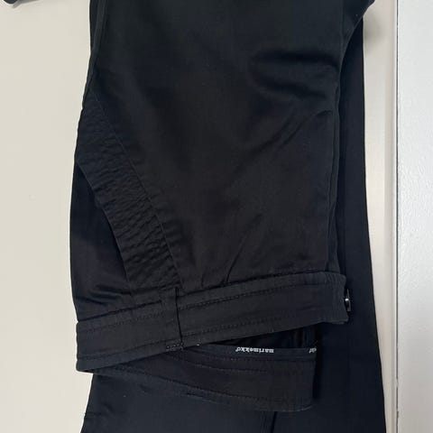 Samu-Jussi Kosken suunnittelemat mustat housut. Housuissa on taskut, yksi tasku takana ja vyönlenkit. Lahkeet eivät ole täyspitkät.