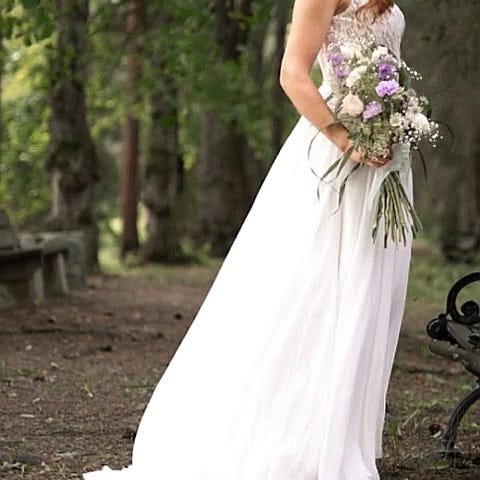 Ihana merenneitomallinen Sis Idman hääpuku pitsihihoilla ja pitkällä laahuksella. Ostettu reilu vuosi sitten ateljee Katariinasta.