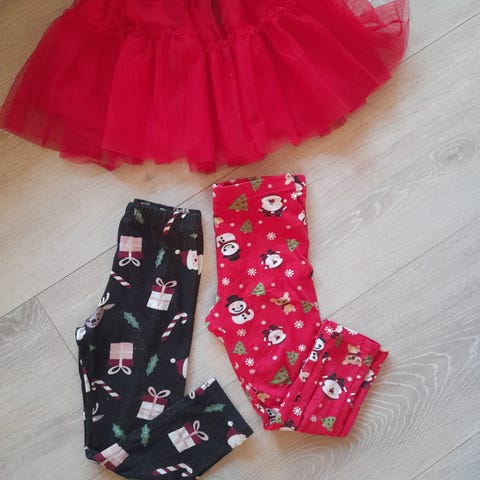 Punainen mekko 98, toinen mekko 98/104 ja housut 104.