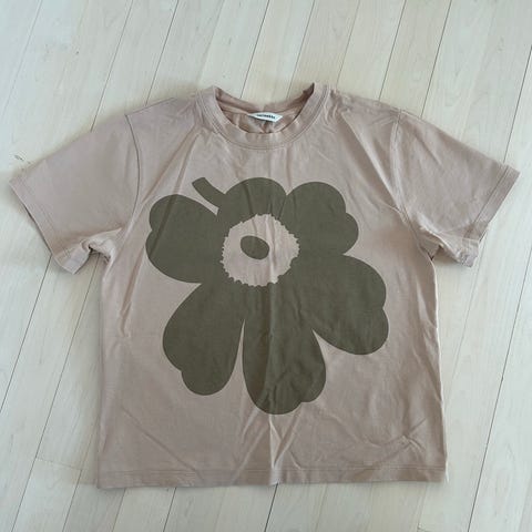 Marimekon unikko T-paita koko M. Menee kivasti oversizena S kokoiselle, M kokoiselle alkaa olla jo aika tiukka. Aika lyhyt malli, muutaman kerran pesussa käynyt ja lyhentynyt kovasti.