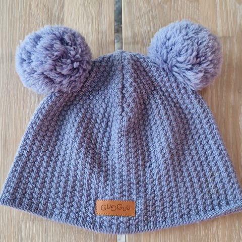 Vaaleansininen Gugguun tupsupipo, pehmeää ja lämmintä merinovillaa. Koko S joka vastaa noin 6-12 kk.