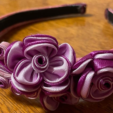 Vaaleanpunainen ruusuinen hiuskoristeen muotoilu. Hiuspanta on valmistettu satiinikankaasta. Se näyttää erittäin teksturoidulta.