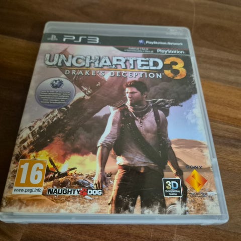 Uncharted 3 Drake's Deception Playstation 3 -peli. Toimii Playstation 3 -pelikonsolilla. Peli on seikkailu- ja toimintapeli, jossa pelaaja seuraa päähenkilö Nathan Draken seikkailuja. Ikäsuositus 16+. Sisältää pelilevyn ja alkuperäisen kotelon.