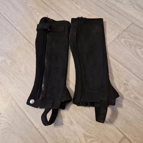 Ehjät chapsit. Pituus korkeimmasta kohdasta n. 41 cm, leveys leveimmästä kohdasta n. 29 cm. Olleet käytössä noin 160 cm pituisella tytöllä.