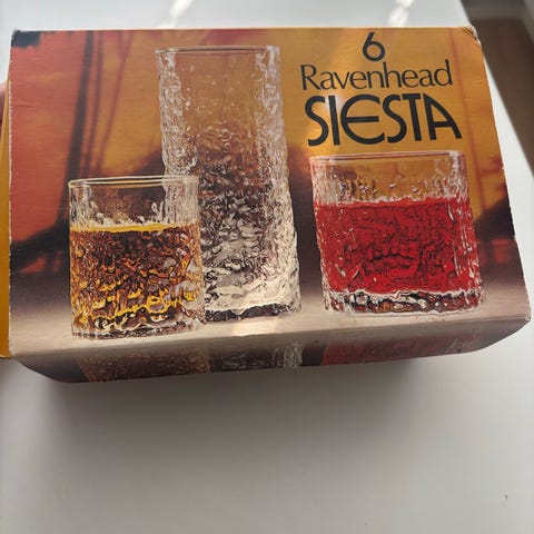 Myydään 6 kpl. Ravenhead Siesta laseja. Lasit ovat 70- luvulta. Lasit ovat aika hyvässä kunnossa, harvoin käytetty. Pienet ja söpöt. Halkaisija 6 cm, korkeus 7 cm.