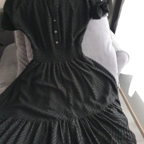 Harmikseni myyntiin, kun itselle hieman pieni. Kaksi kertaa ollut päällä. Sivussa piilovetoketju ja 3/4 osa hihat. Koko M, mutta sanoisin että enemmän S koolle.