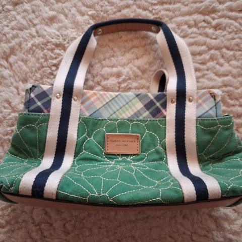 Tommy Hilfiger laukku, irrotettavalla hihnalla. Lokeroita laukussa kolme, keskimmäinen lokero iso,jossa vetoketjutasku sisällä. Laukun taskujen kiinnitys magneettimekanismi. Siistikuntoinen laukku,koko leveys n.33cm, korkeus n.22 cm.