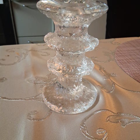 Iittala Kivi kynttilänjalka kirkas lasi, halkaisija noin 6 cm. Sopii pienille kynttilöille kuten tuikkukynttilöille. Materiaali kirkas lasi, muotoilu pyöreä ja koristeellinen.