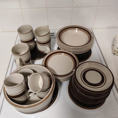 Arabia Ruska astiasto setti, joka sisältää kuvan mukaisesti erilaisia lautasia, kuppeja, teekannun, pyöreän tarjoilulautasen. Myös soikea tarjoilu/paistivati erillisessä kuvassa. Astiat ovat pääosin hyväkuntoisia, joissakin käytönjälkiä havaittavissa.