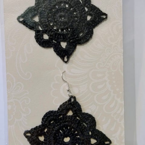 Käsityönä virkatut näyttävän kokoiset korvakorut. Materiaali puuvillalanka, koukut korumetallia. Virkattu osuus kevyesti kovetettu. Vaikka riipukset ovat isoja, korvakorut ovat kevyet.