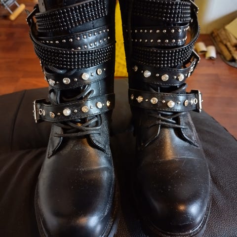 mustat maiharit 39, edessä nyöritys ja sivussa soljet, vetoketju sisäsivulla