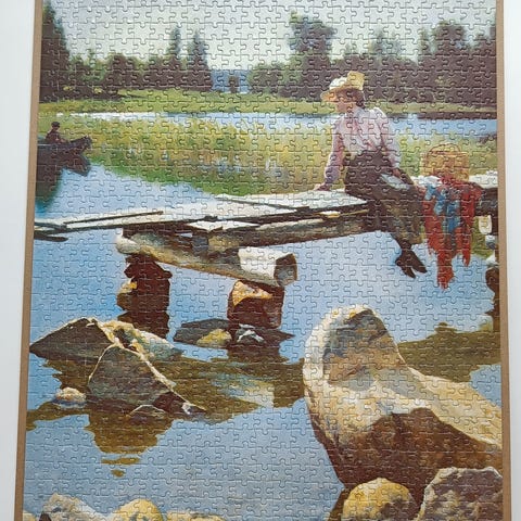 Schmidt Thomas Kinkade palapeli, jossa on kaupunkimaisema ja silta. Palapelin koko 968 692 mm.