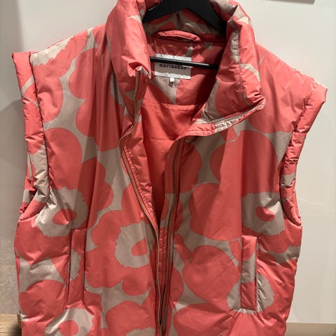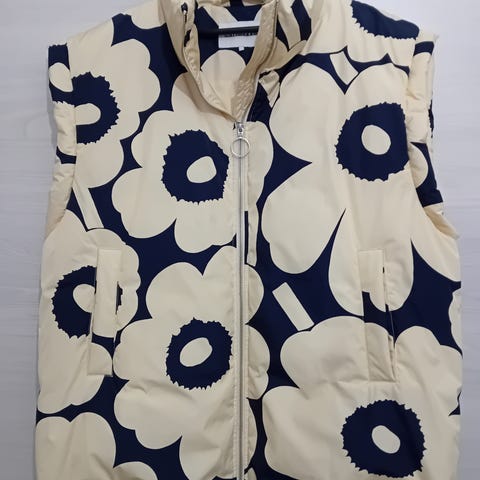 Unikko-kuosisessa Huurre-untuvaliivissä on rento istuvuus ja suora leikkaus. Liivissä on korkea kaulus ja metallivetoketju sekä listataskut edessä. Helmassa on kiristysnyöri.