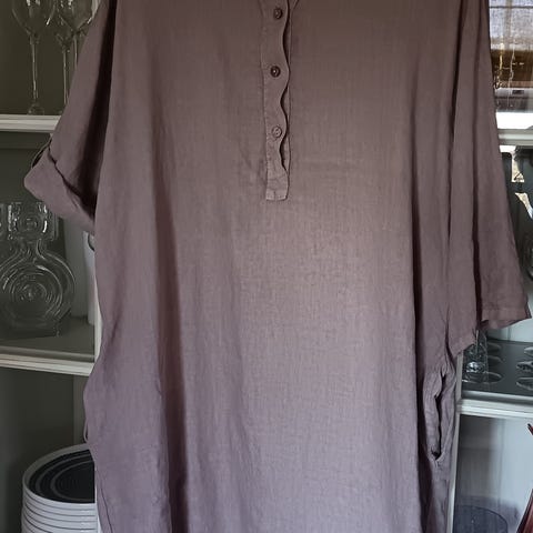 Cubus kanelinvärinen takkimekko pellavaa ja puuvillaa. Koko XXL, kai-kai n 70 cm ja olka-helma n 110 cm. Väri hieman haalistunut. Taskut sivusaumoissa ja halkiot sivuilla helmassa.