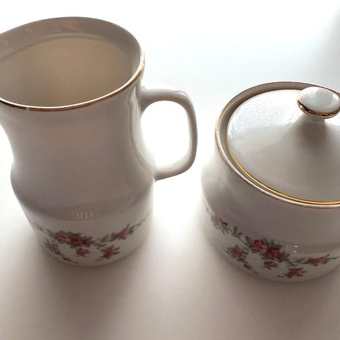 Hurmaava ja täysin ehjät ruusuaiheiset sokerikko ja kermakko.