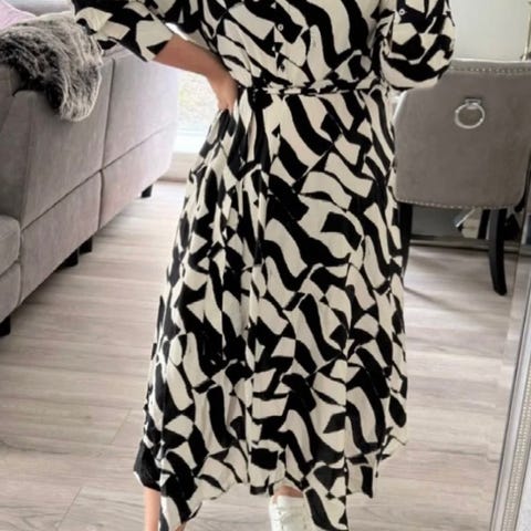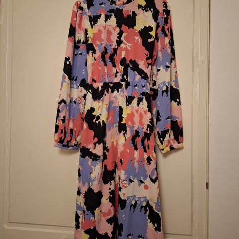 Hauska bohotyylinen röyhelömekko kotiin tai juhlaan, kangas on venyvää. Koko sopii M-XL kokoiselle. Mukava päällä.