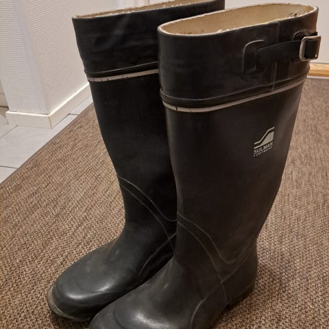 Mustat, vedenpitävät saappaat, joissa on kumipohja ja sisävuori. Merkki Sulman Footwear. Varressa kiristysnauha. Koko 46. Sisäpuolella yläosassa kellastumaa. Vain nouto. Maksu käteisellä/MobilePaylla.